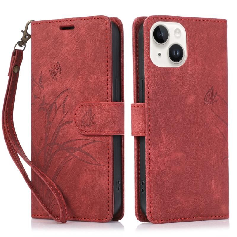 For iPhone 15 Plus Orchid Butterfly Embossed Leather Phone Case(Red)