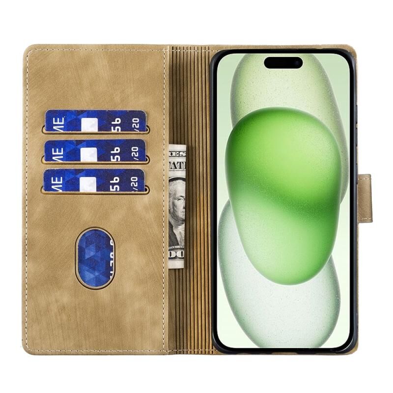 6. Λειτουργία Πορτοφολιού: Η δερμάτινη θήκη είναι εξοπλισμένη με τρεις υποδοχές καρτών και ένα διαμέρισμα για μετρητά, που μπορούν να χωρέσουν κάρτες και ένα μικρό ποσό χαρτονομισμάτων.