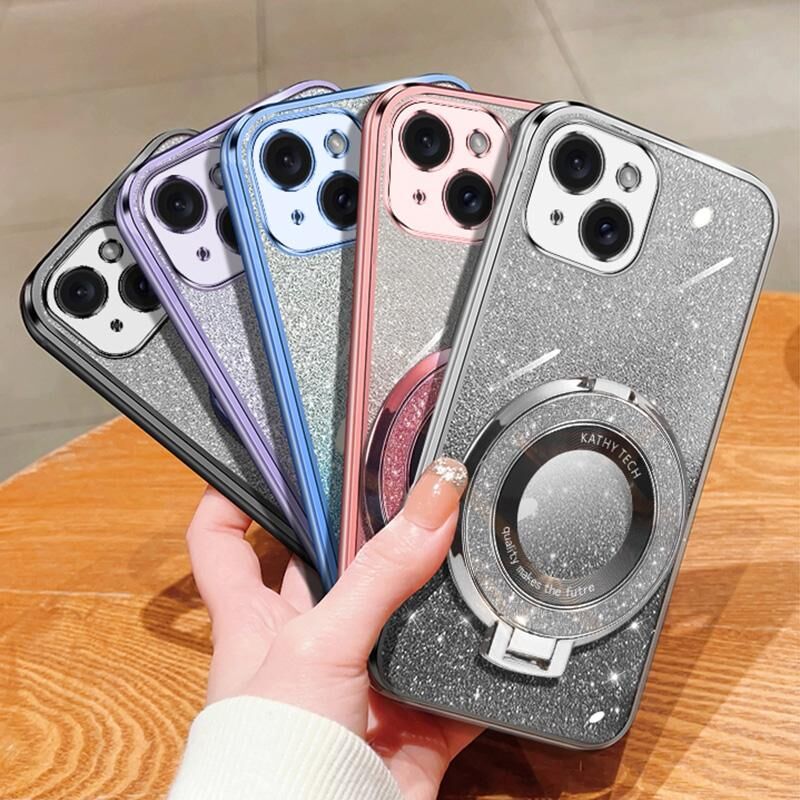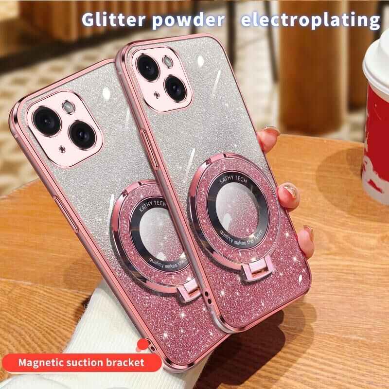 For iPhone 15 Plus Plated Gradient Glitter Round Holder TPU Phone Case(Pink)