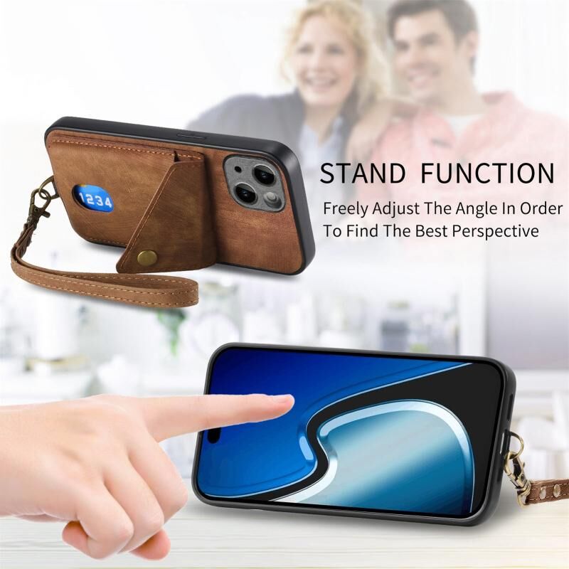 Θήκη τηλεφώνου από δέρμα με αναδιπλούμενο σχέδιο και θήκη καρτών για iPhone 15 Plus (Μαύρο) με λουρί.