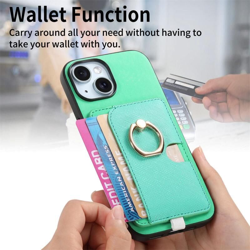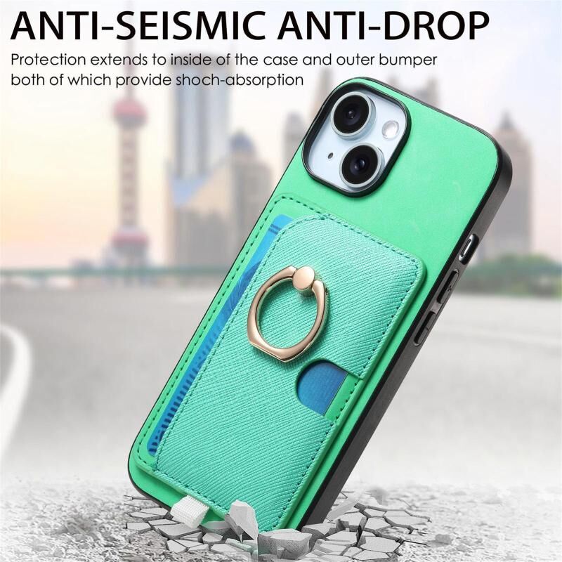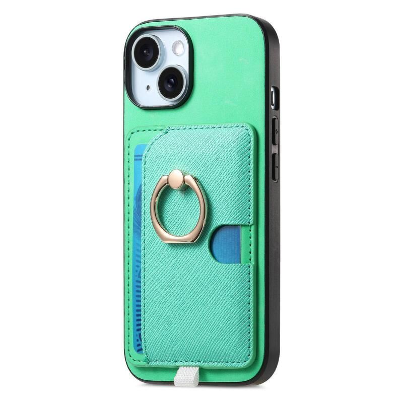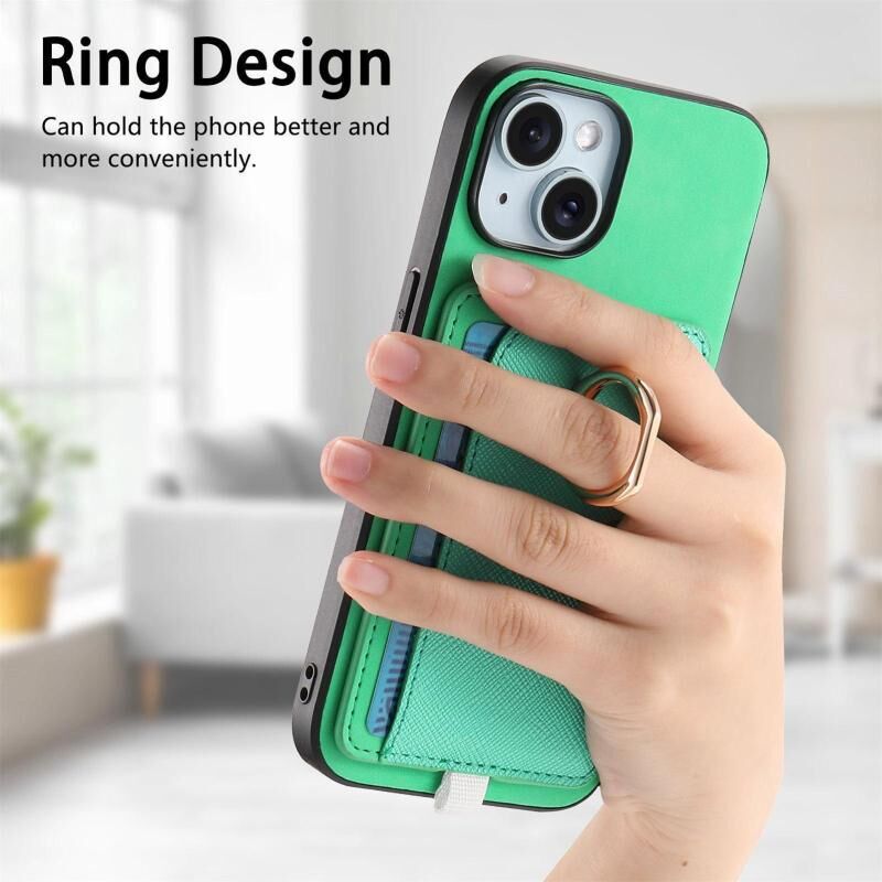 For iPhone 15 Plus Retro Cross Leather Ring Side Insert Card Bag MagSafe Phone Case(Green)