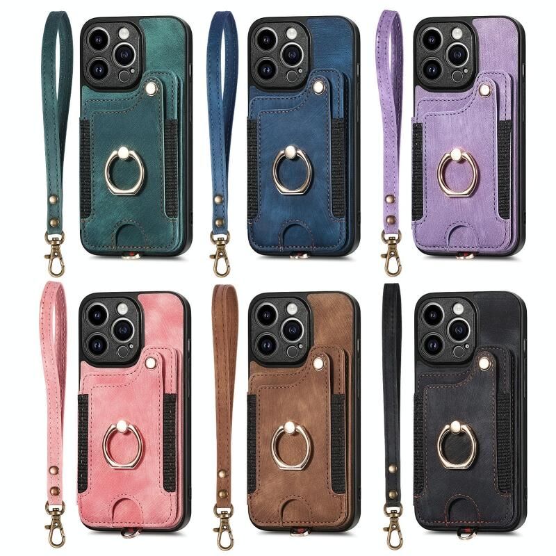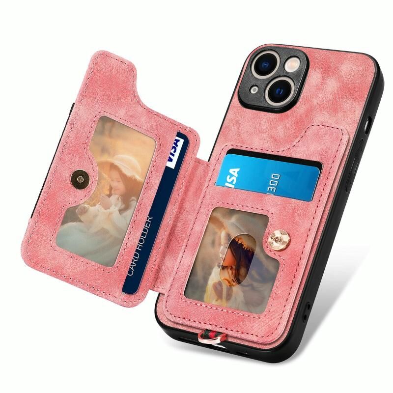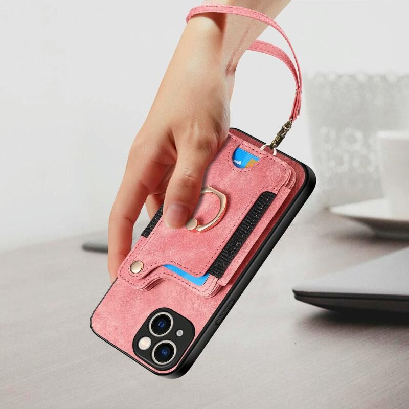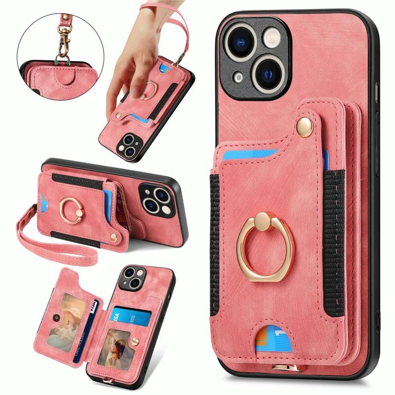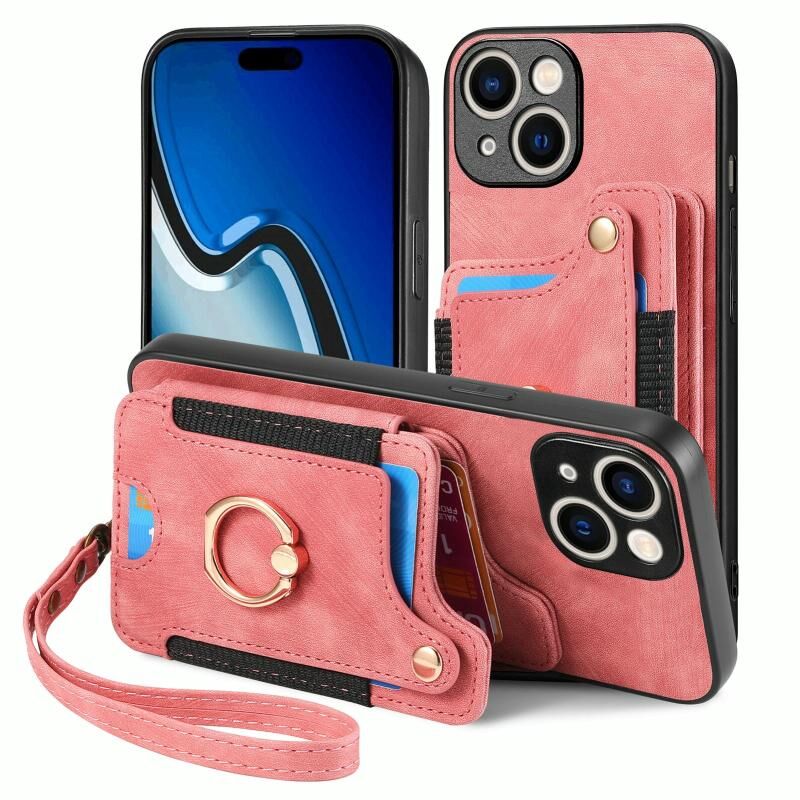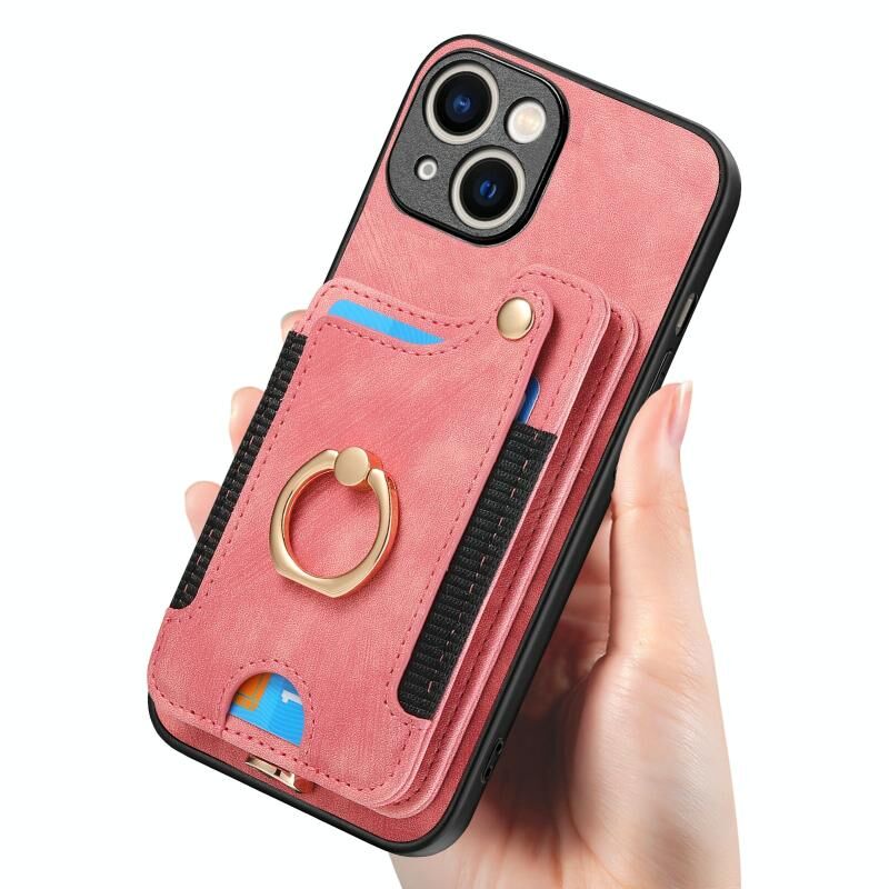Θήκη τηλεφώνου για iPhone 15 Plus με ρετρό υφή, δακτύλιο και πολλαπλές θήκες καρτών (Ροζ)