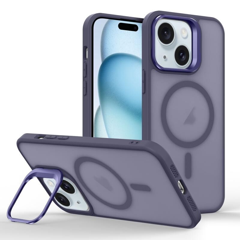 For iPhone 15 Plus Skin Feel Lens Holder Magsafe Phone Case(Deep Purple)