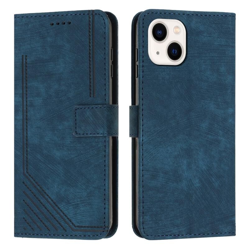 Θήκη τηλεφώνου από δέρμα με υφή δέρματος και σχέδιο ρίγας για iPhone 15 Plus με κορδόνι (Μπλε)