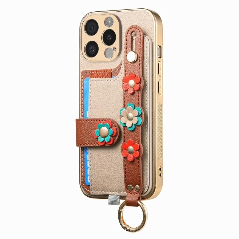 Θήκη τηλεφώνου για iPhone 15 Plus με καρπούς λουλουδιών σε στερεοσκοπική απεικόνιση και θήκη κάρτας (Χακί)