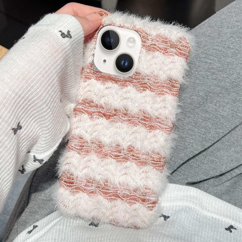 For iPhone 15 Plus Striped Fabric Plush TPU Phone Case(Pink)