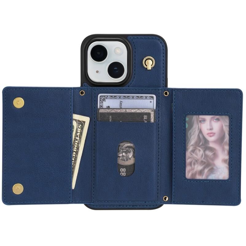 For iPhone 15 Plus Three Fold Card Bag Phone Case with Long Lanyard(Blue)