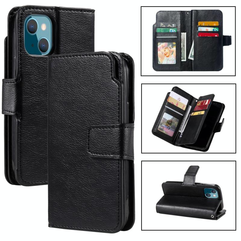 For iPhone 15 Plus Tri-Fold 9-Card Wallets Leather Phone Case(Black)