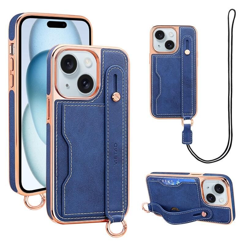 Θήκη κινητού τηλεφώνου VIETAO για iPhone 15 Plus με θήκη κάρτας και λουρί καρπού (Μπλε) (VIETAO)