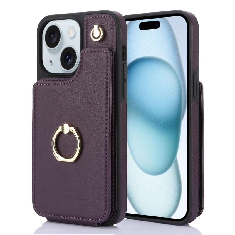 For iPhone 15 Plus YM005 Skin Feel Card Bag Phone Case with Long Lanyard(Dark Purple)
