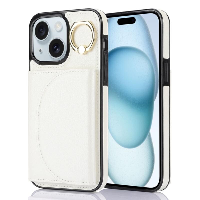 For iPhone 15 Plus YM007 Ring Holder Card Bag Skin Feel Phone Case(White)