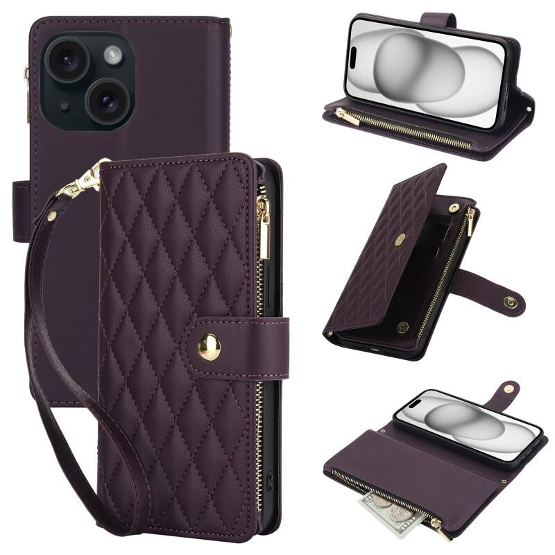 For iPhone 15 Plus YM016 Rhombic Zipper Card Wallet Leather Phone Case with Lanyard(Dark Purple)