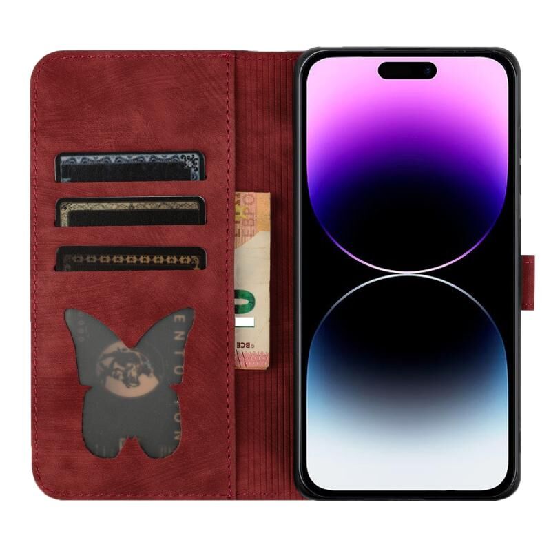 Θήκη τηλεφώνου από δέρμα με ανάγλυφο σχέδιο πεταλούδας και γάτας για iPhone 15 Pro (Μωβ)