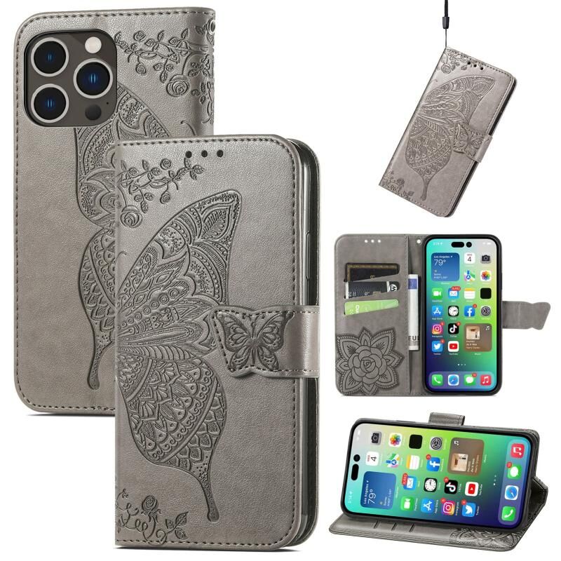 Θήκη τηλεφώνου από δέρμα με ανάγλυφο σχέδιο πεταλούδας και λουλουδιών για iPhone 15 Pro (Σκούρο Μωβ)