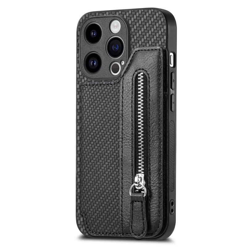 Θήκη τηλεφώνου τύπου πορτοφολιού με οριζόντιο άνοιγμα και φερμουάρ, από ανθρακονήματα για iPhone 15 Pro (Μαύρο)
