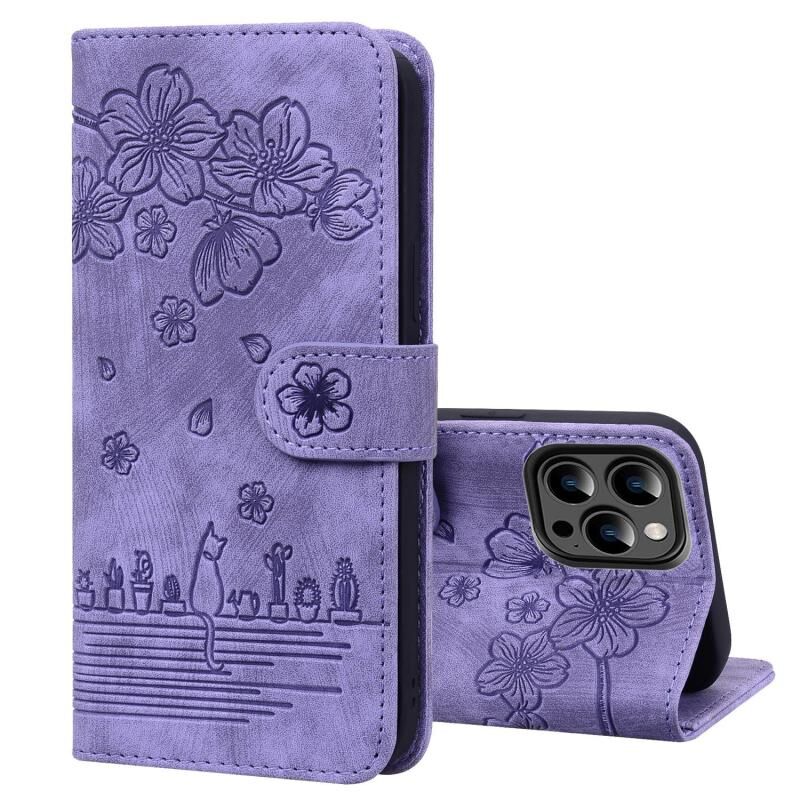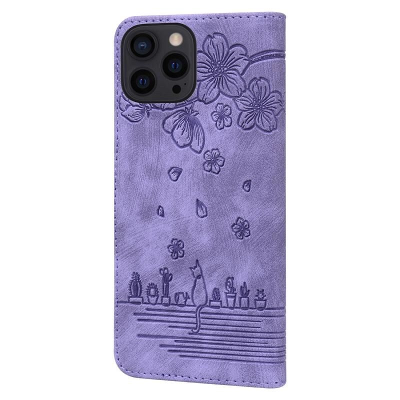 For iPhone 15 Pro Cartoon Sakura Cat Embossed Leather Phone Case(Purple)