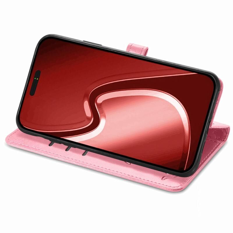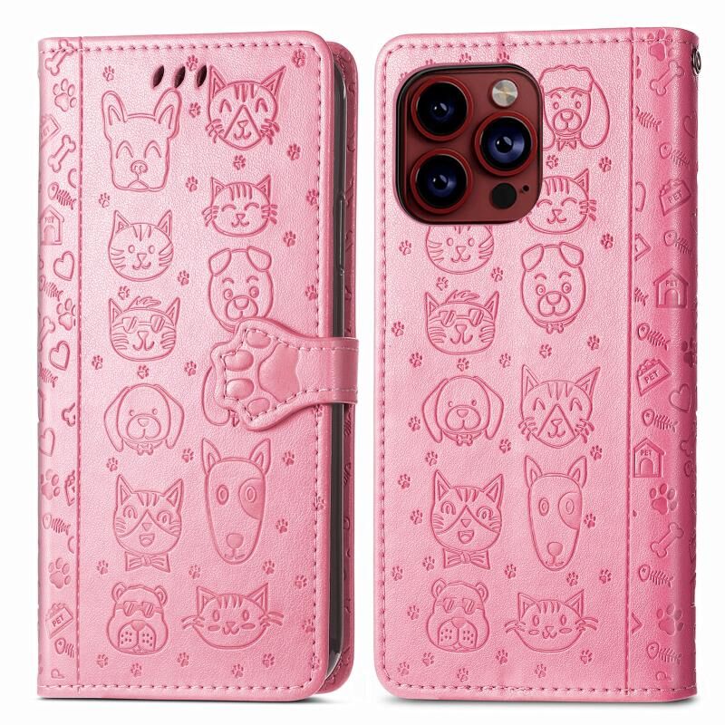 For iPhone 15 Pro Cat and Dog Embossed Leather Phone Case(Pink)
