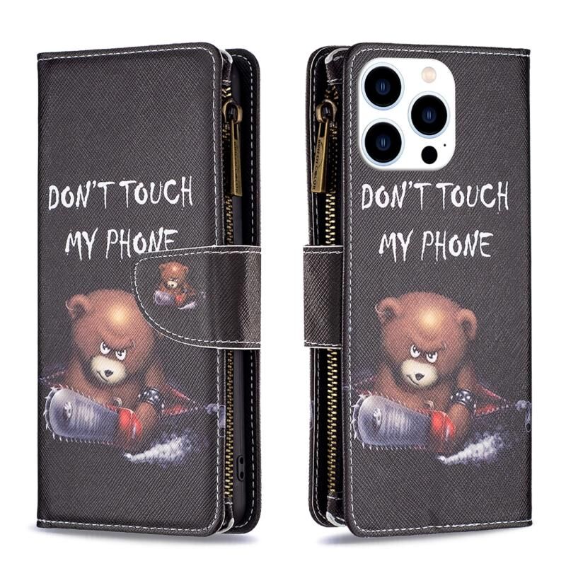 Θήκη τηλεφώνου από δέρμα με φερμουάρ και σχέδιο πολύχρωμης ζωγραφικής για iPhone 15 Pro (Αρκούδα)