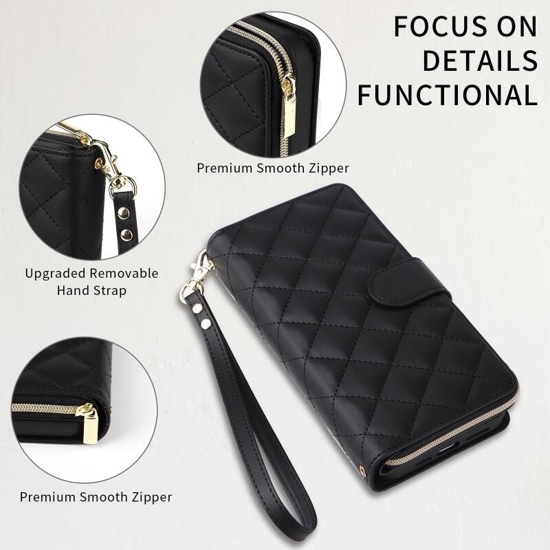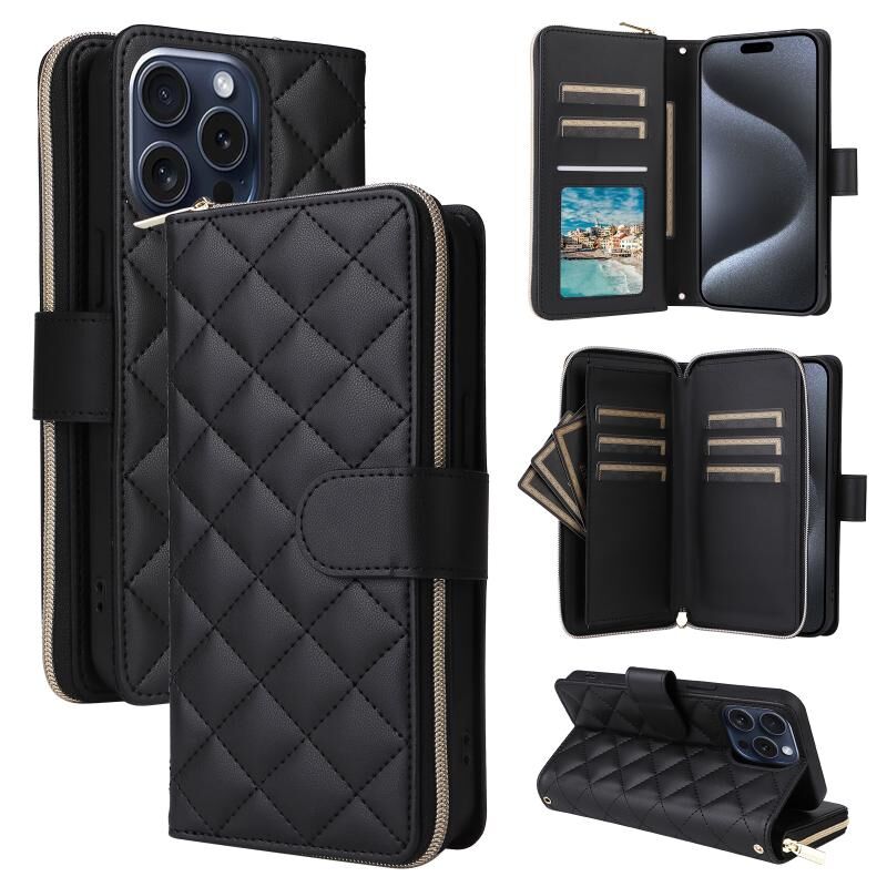 Θήκη τηλεφώνου από δέρμα για iPhone 15 Pro, τύπου crossbody, με ρόμβους, φερμουάρ, αγκράφα Tower και λουρί (Μωβ)