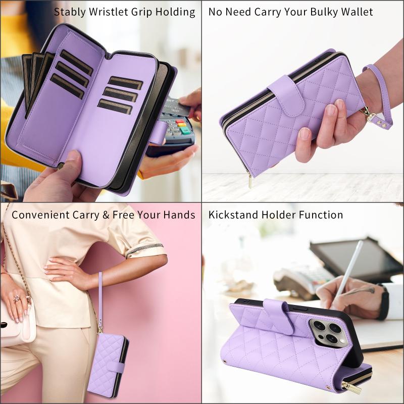 Θήκη τηλεφώνου από δέρμα για iPhone 15 Pro, τύπου crossbody, με ρόμβους, φερμουάρ, αγκράφα Tower και λουρί (Μωβ)