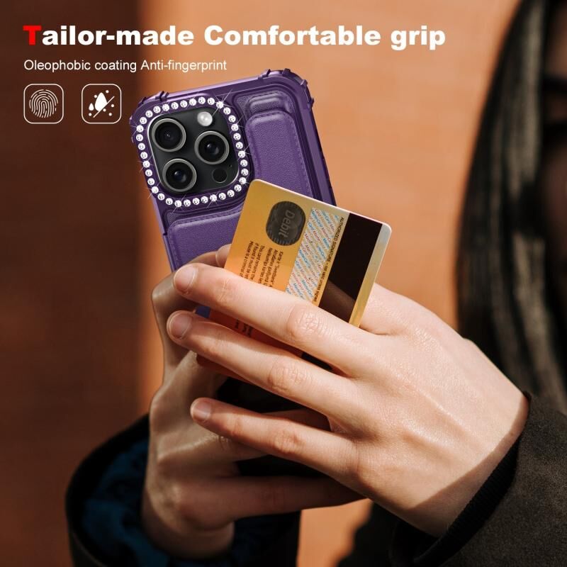 For iPhone 15 Pro Diamond Horizontal Card Bag Leather Phone Case(Purple)