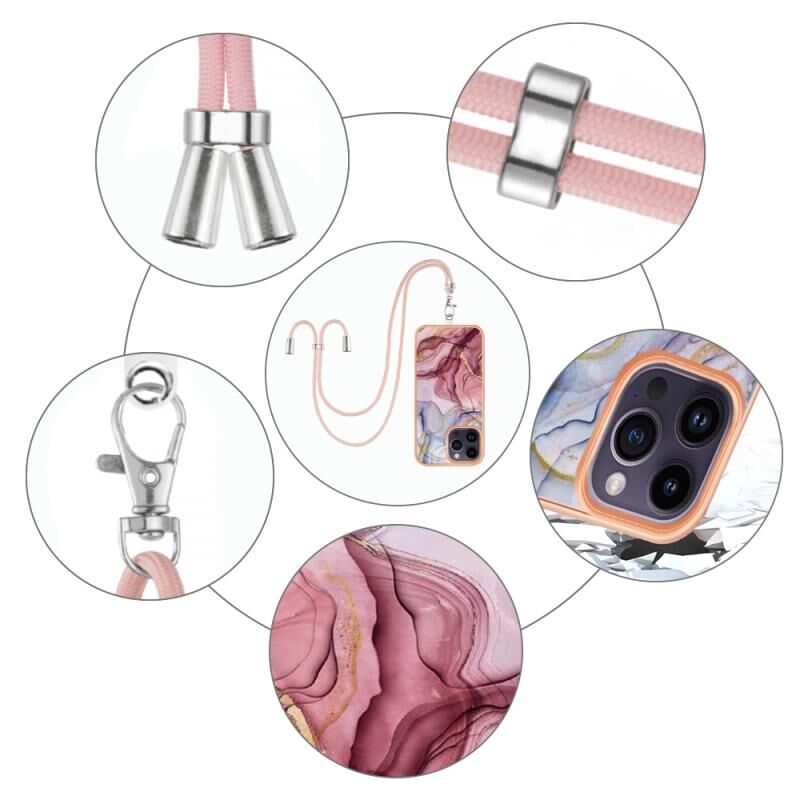 Θήκη τηλεφώνου με επιμετάλλωση, σχέδιο μάρμαρου, διπλής όψης IMD για iPhone 15 Pro με κορδόνι (Κόκκινο Ρόδι 014)