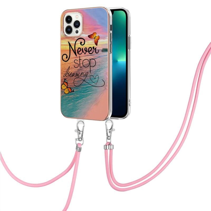 Θήκη για iPhone 15 Pro με σχέδιο επιμετάλλωσης IMD TPU αντικραδασμική με λουρί λαιμού (Πεταλούδα κυνηγιού ονείρων)