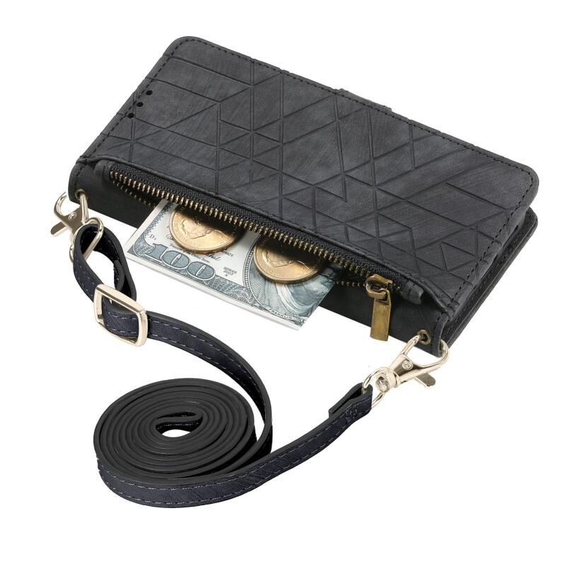 Θήκη κινητού τηλεφώνου δερμάτινη με φερμουάρ και γεωμετρικό σχέδιο για iPhone 15 Pro, με πλευρική αγκράφα και λουρί crossbody (Καφέ)