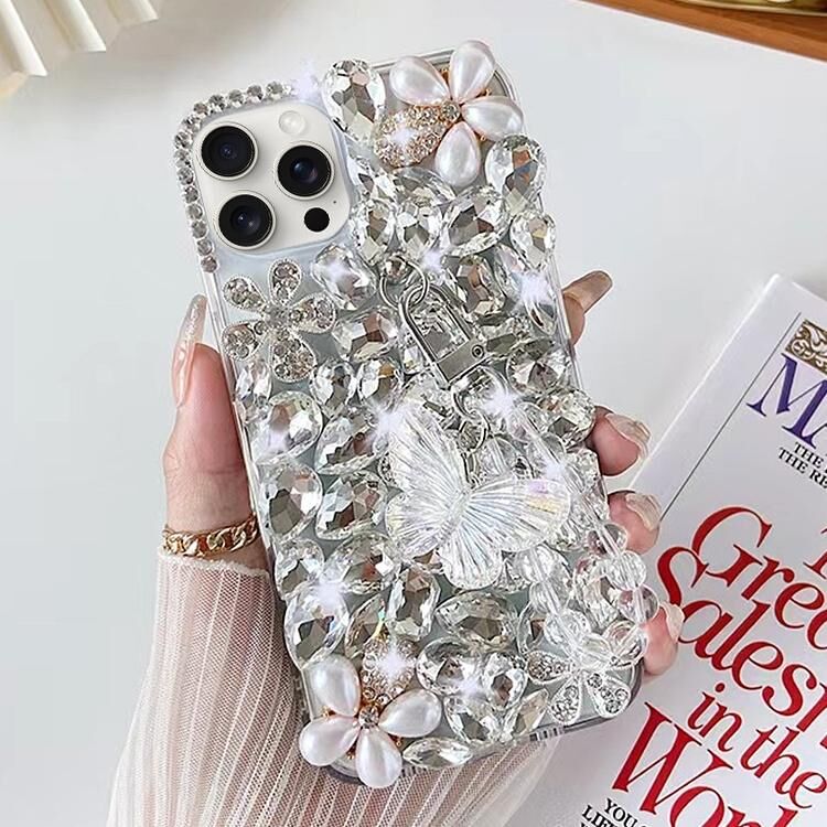 Θήκη τηλεφώνου για iPhone 15 Pro, χειροποίητη, με ενσωματωμένα διαμάντια και σχέδιο πεταλούδας από PC (Λευκό)
