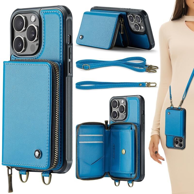 Θήκη τηλεφώνου από δέρμα JEEHOOD C22 Series με φερμουάρ και διπλό κορδόνι για iPhone 15 Pro (Μαύρο) (JEEHOOD)