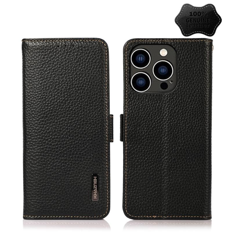 For iPhone 15 Pro KHAZNEH Side-Magnetic Litchi Genuine Leather RFID Phone Case(Black)