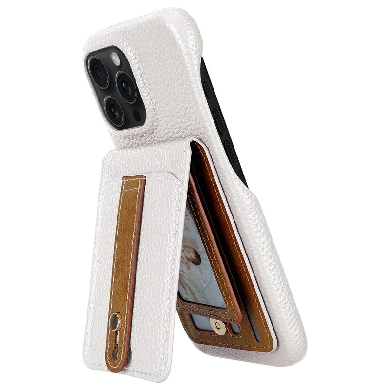 For iPhone 15 Pro Litchi Texture Leather Ring Card Bag Holder Phone Case(White)