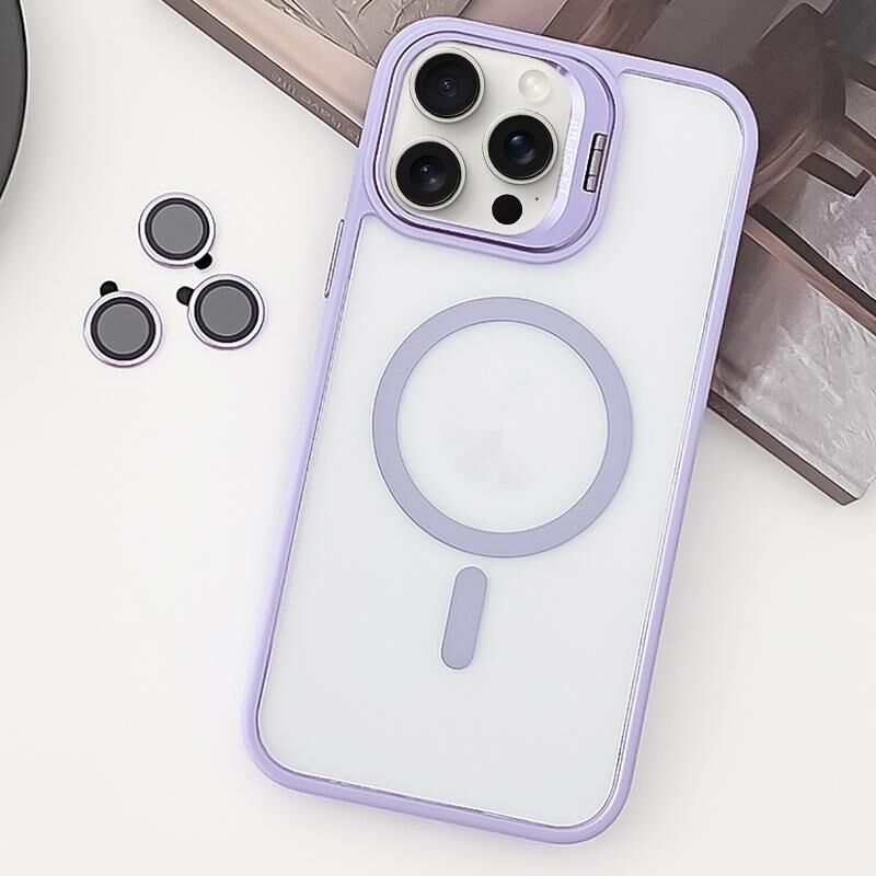 For iPhone 15 Pro MagSafe Acrylic Hybrid TPU Holder Phone Case with Lens film(Light Purple)