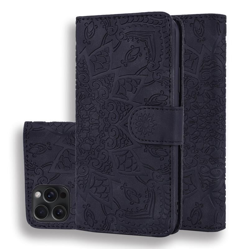 For iPhone 15 Pro Mandala Embossed Dual-Fold Calf Leather Phone Case(Black)