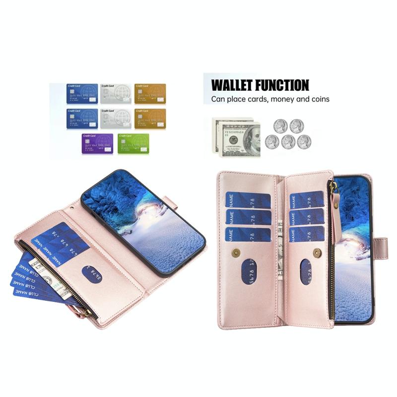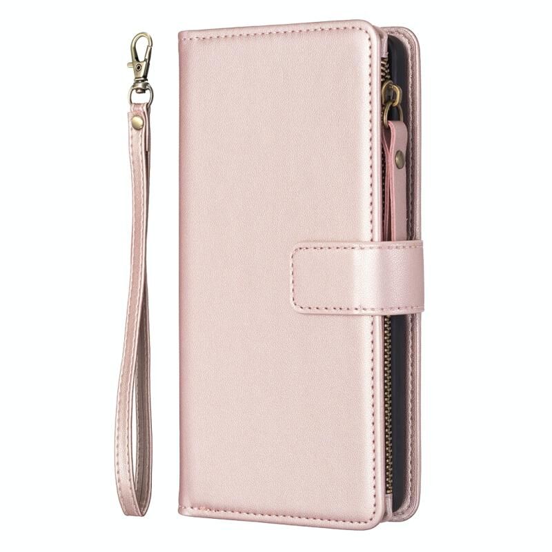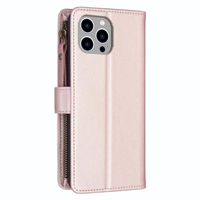 Θήκη τηλεφώνου τύπου flip από δέρμα με φερμουάρ και 9 θήκες για κάρτες για iPhone 15 Pro Max (Ροζ χρυσός)