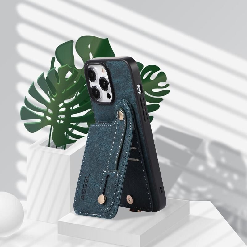 Θήκη τηλεφώνου για iPhone 15 Pro Max ABEEL με υφή δέρματος λυτσί, κάρτας από PU (Μπλε)