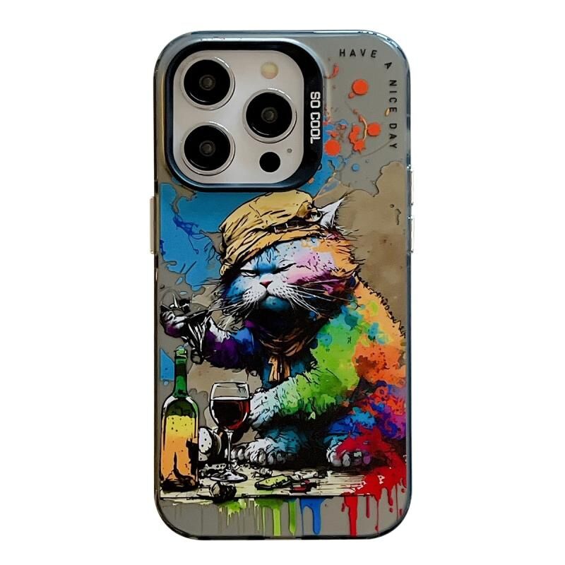 Θήκη κινητού τηλεφώνου για iPhone 15 Pro Max, σειρά λαδερών ζωγραφικών με σχέδια ζώων (Γάτα που πίνει) - PC + TPU.