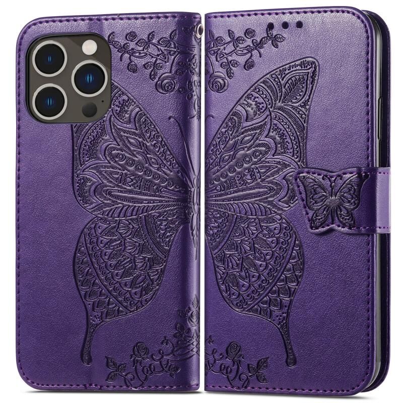 Θήκη τηλεφώνου από δέρμα με ανάγλυφο σχέδιο πεταλούδας και λουλουδιών για iPhone 15 Pro Max (Μαύρο)