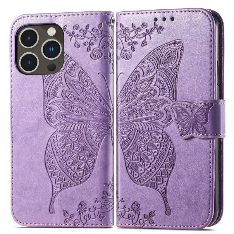 Θήκη τηλεφώνου από δέρμα με ανάγλυφο σχέδιο πεταλούδας και λουλουδιών για iPhone 15 Pro Max (Μαύρο)