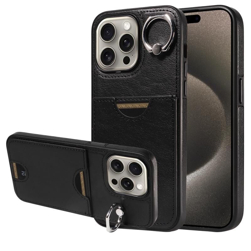 Θήκη τηλεφώνου για iPhone 15 Pro Max με υφή μοσχαρίσιου δέρματος, θήκη κάρτας και δακτύλιο στήριξης (Μαύρο)