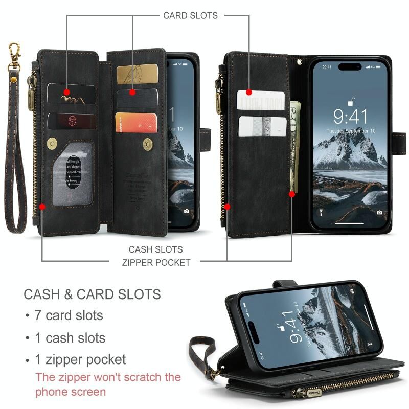 6. 10 card slots + 1 wallet position + 1 zipper bag (actually based on the picture)