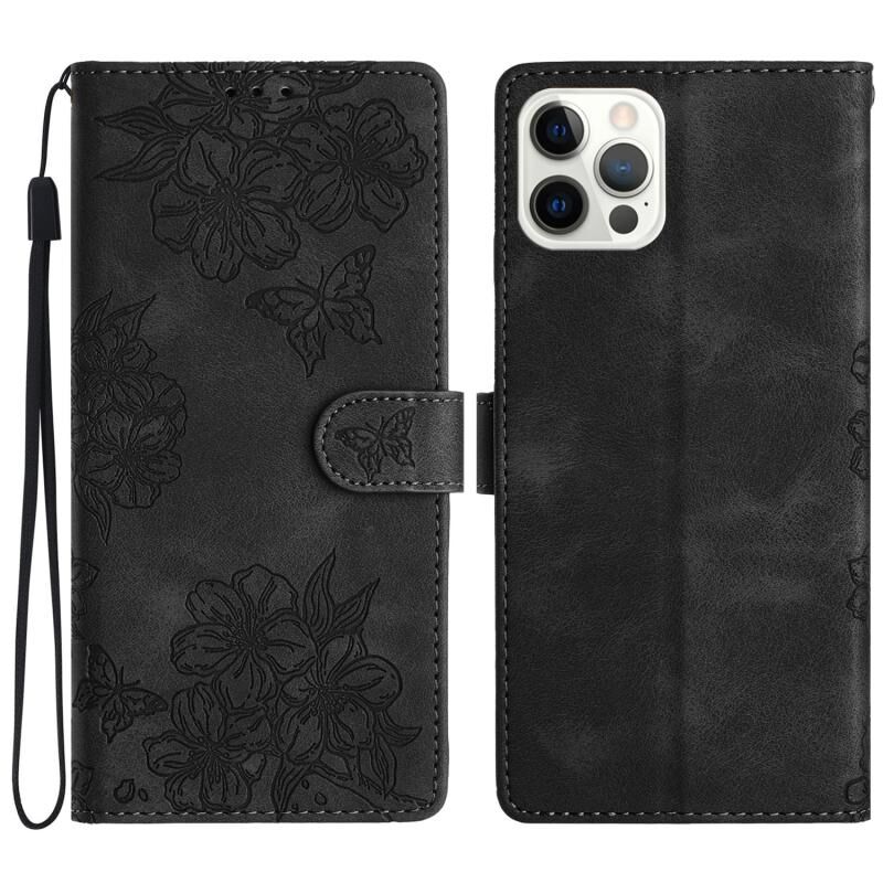 Θήκη τηλεφώνου από PU με ανάγλυφη υφή δέρματος, με σχέδιο κερασιών και πεταλούδας για iPhone 15 Pro Max (Κόκκινο)