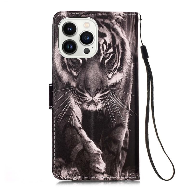 For iPhone 15 Pro Max Colored Drawing Pattern Plain Weave Leather Phone Case(Black And White Tiger)