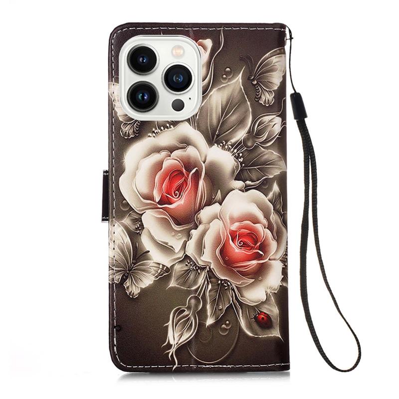 For iPhone 15 Pro Max Colored Drawing Pattern Plain Weave Leather Phone Case(Roses On Black)