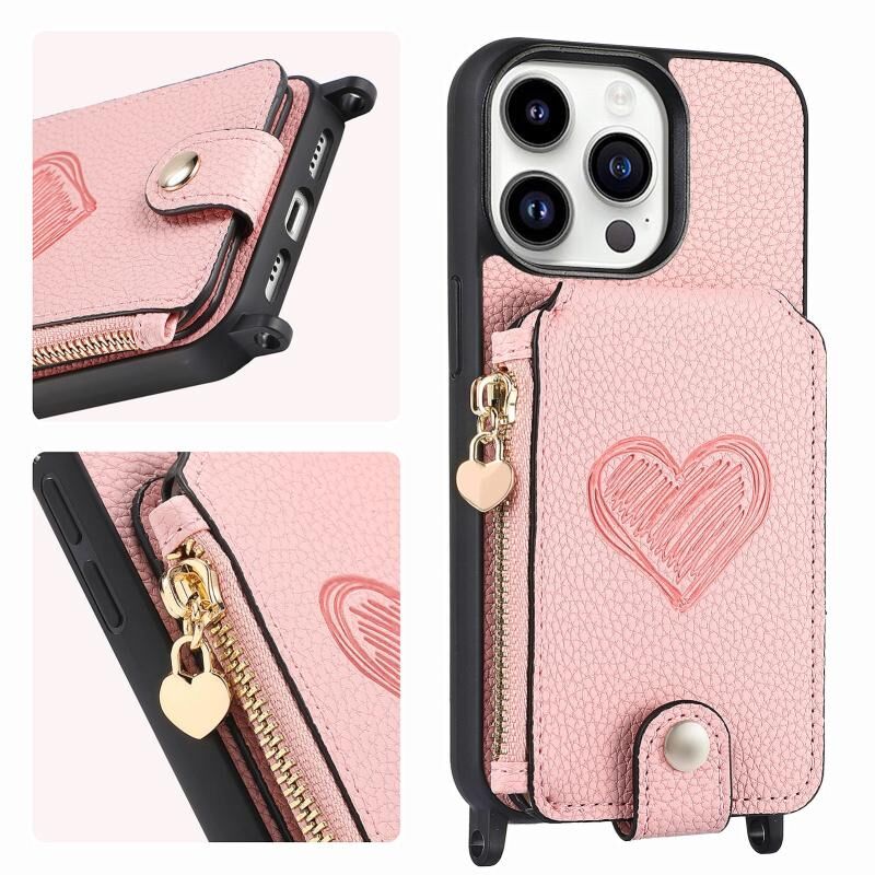 Θήκη κινητού για iPhone 15 Pro Max, διαγώνια, με σχέδιο καρδιάς, φερμουάρ και δέρμα (Λευκό)