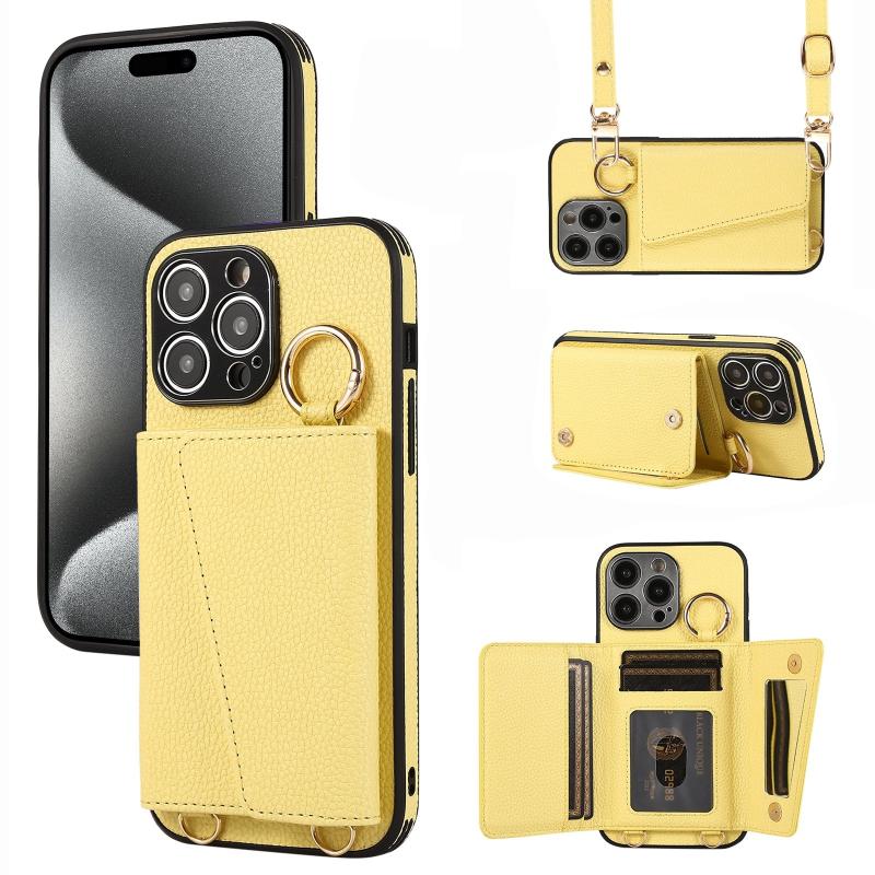 For iPhone 15 Pro Max Crossbody Ring Wallet Leather Back Cover Phone Case(Yellow)