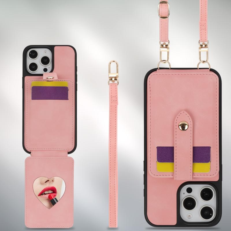 For iPhone 15 Pro Max Crossbody Skin Card Bag Lanyard Phone Case(Pink)