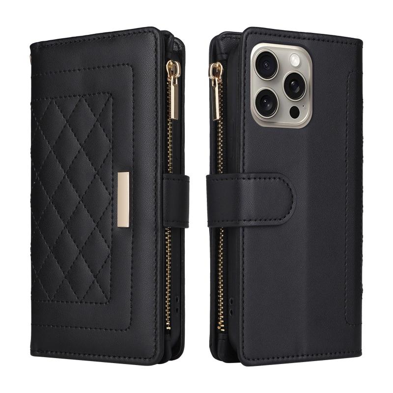 For iPhone 15 Pro Max Crossbody Zipper Wallet Rhombus Leather Phone Case(Black)