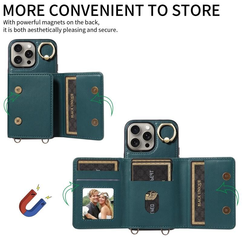 Θήκη τηλεφώνου από δέρμα για iPhone 15 Pro Max με θήκη κάρτας, λουρί Crossbody και δακτύλιο στήριξης (Πράσινο)