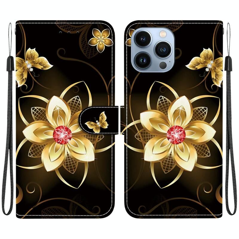 Θήκη τηλεφώνου από δέρμα με πολύχρωμο σχέδιο κρυστάλλινης υφής για iPhone 15 Pro Max (Χρυσό Λουλούδι)